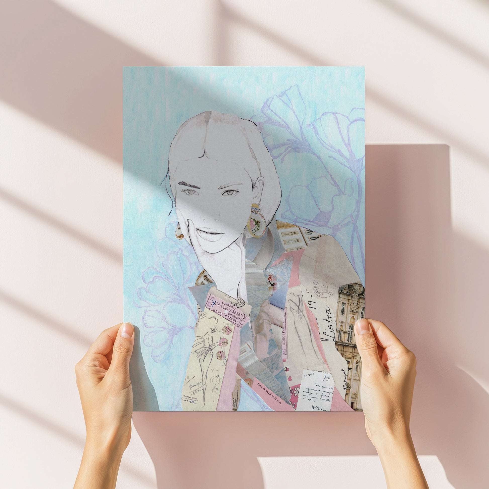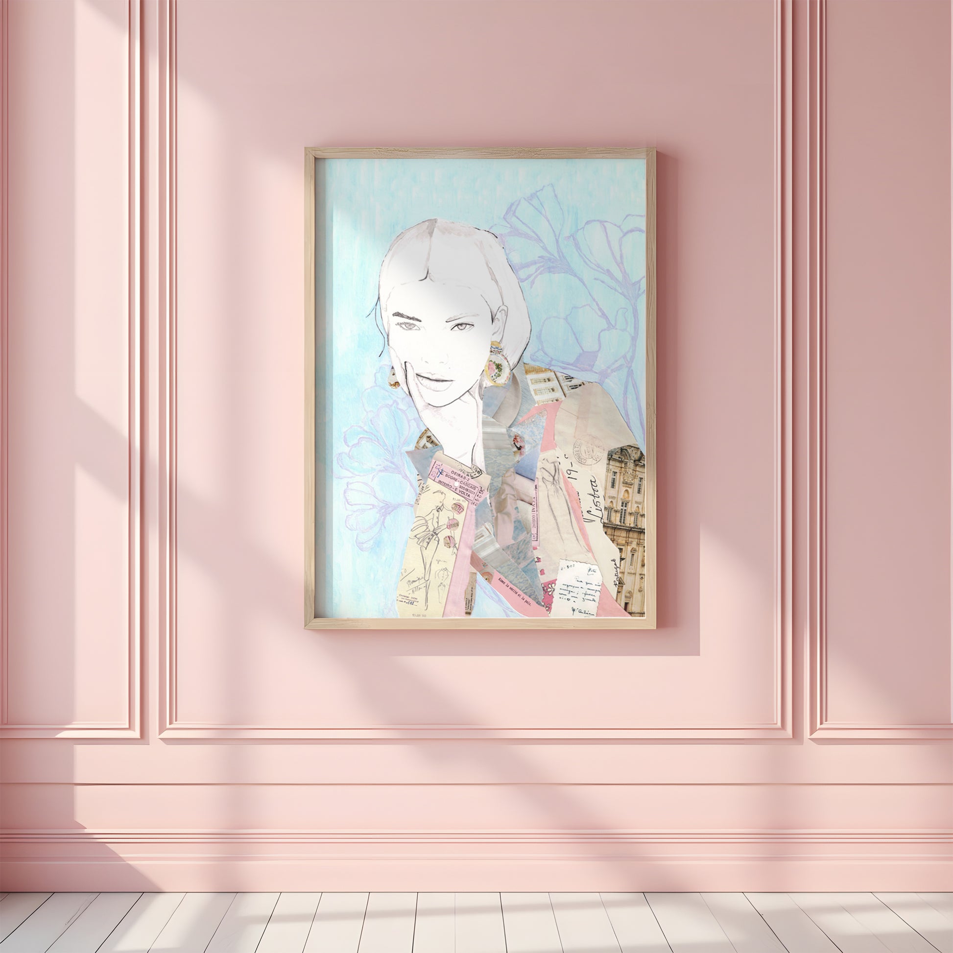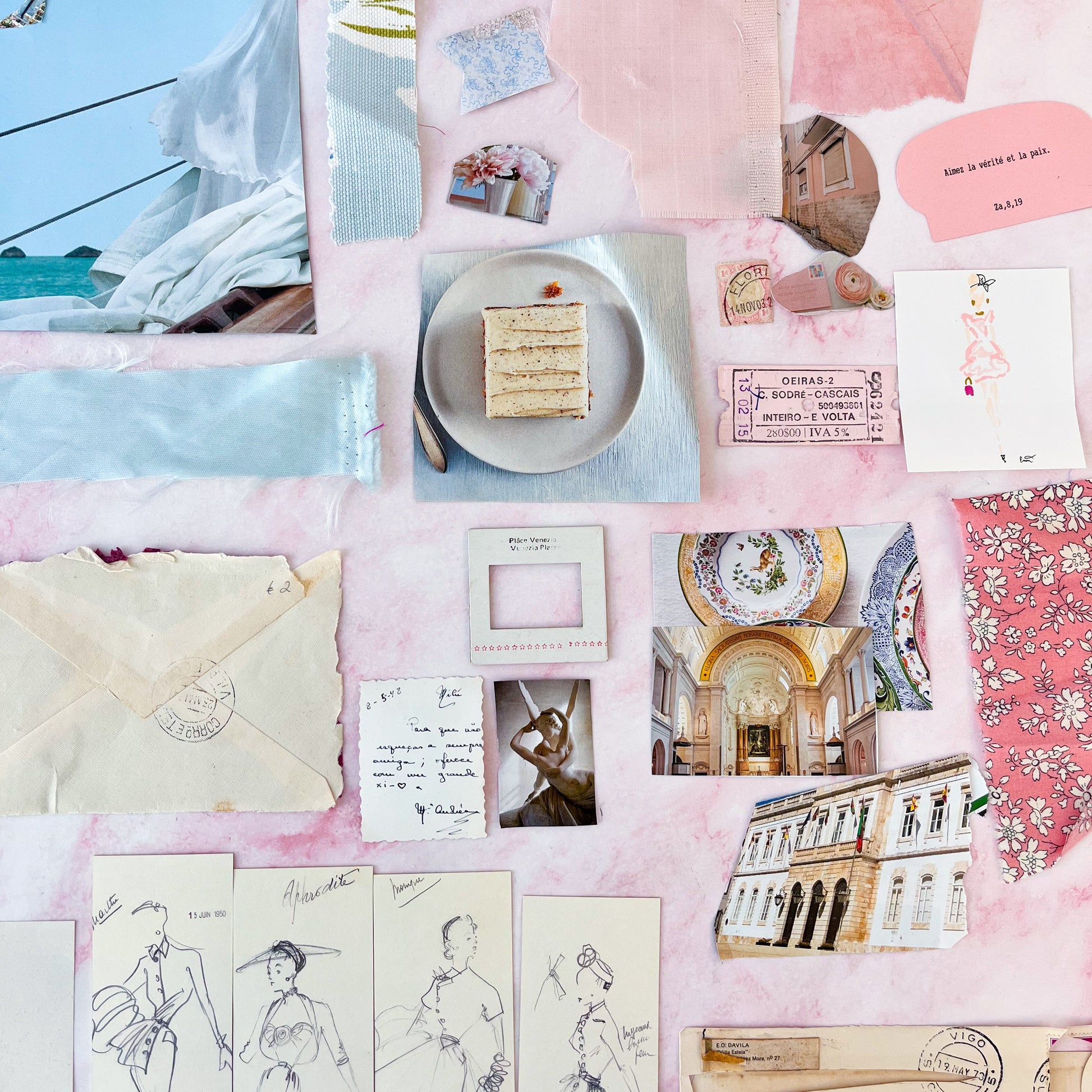 The dreamy background of painted pink and purple flowers on soft blue evokes the romance and creative energy of Montmartre. A small handwritten note is tucked into the collage—a fragment of memory that reflects the intimate stories our style carries and how our clothing becomes a vessel for personal history, connecting our style, memory, and self-expression.