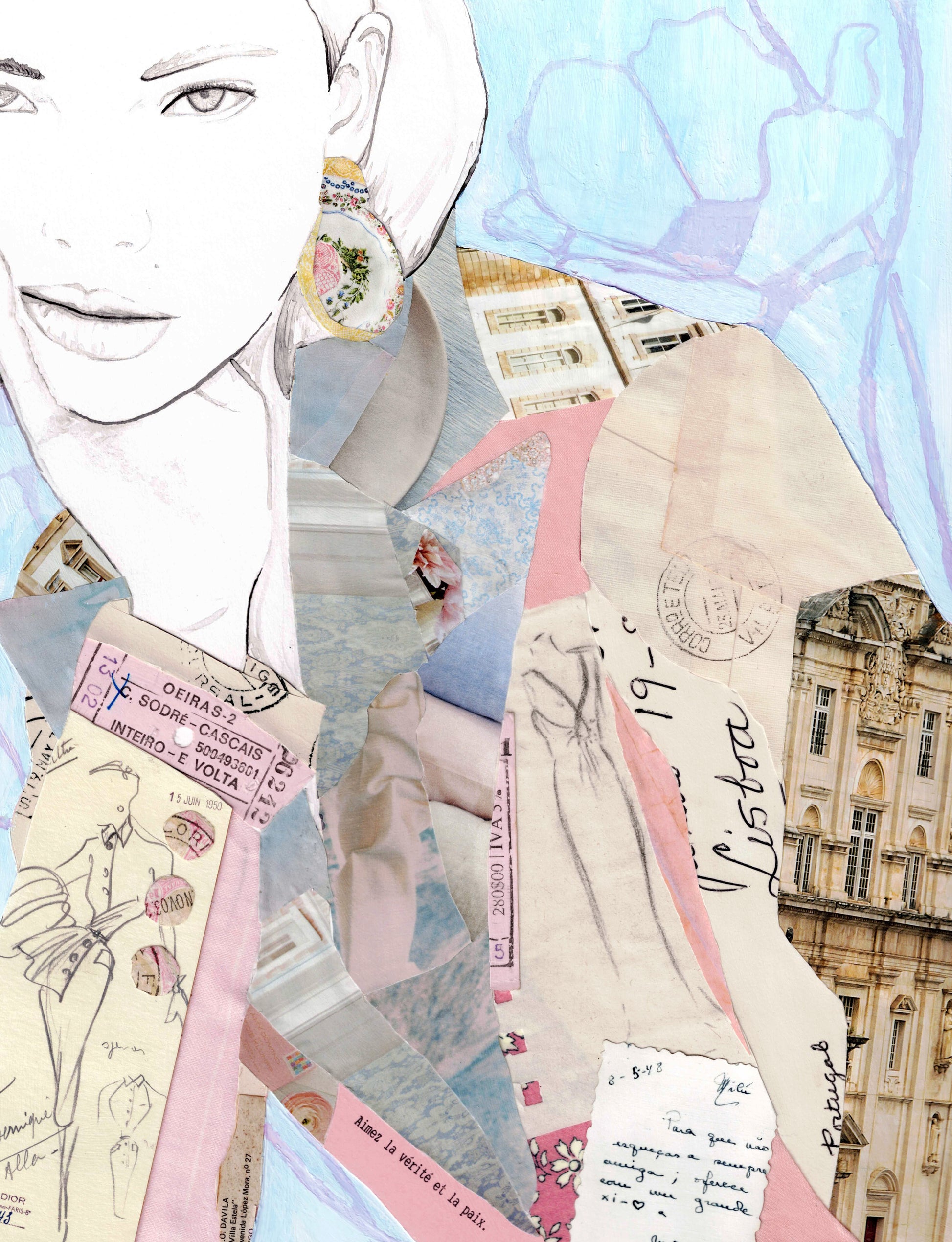 "Missive in Montmartre" features a portrait built from vintage letters, old train tickets, a Dior sketch, and an earlier fashion illustration from Emily's archives.