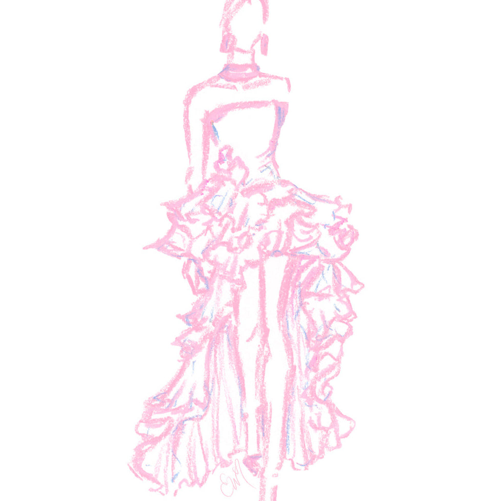Chic fashion illustration art print, drawn in chalk pastel. Each piece captures movement, personality, and couture-inspired style, balancing drama and playfulness with vibrant color.