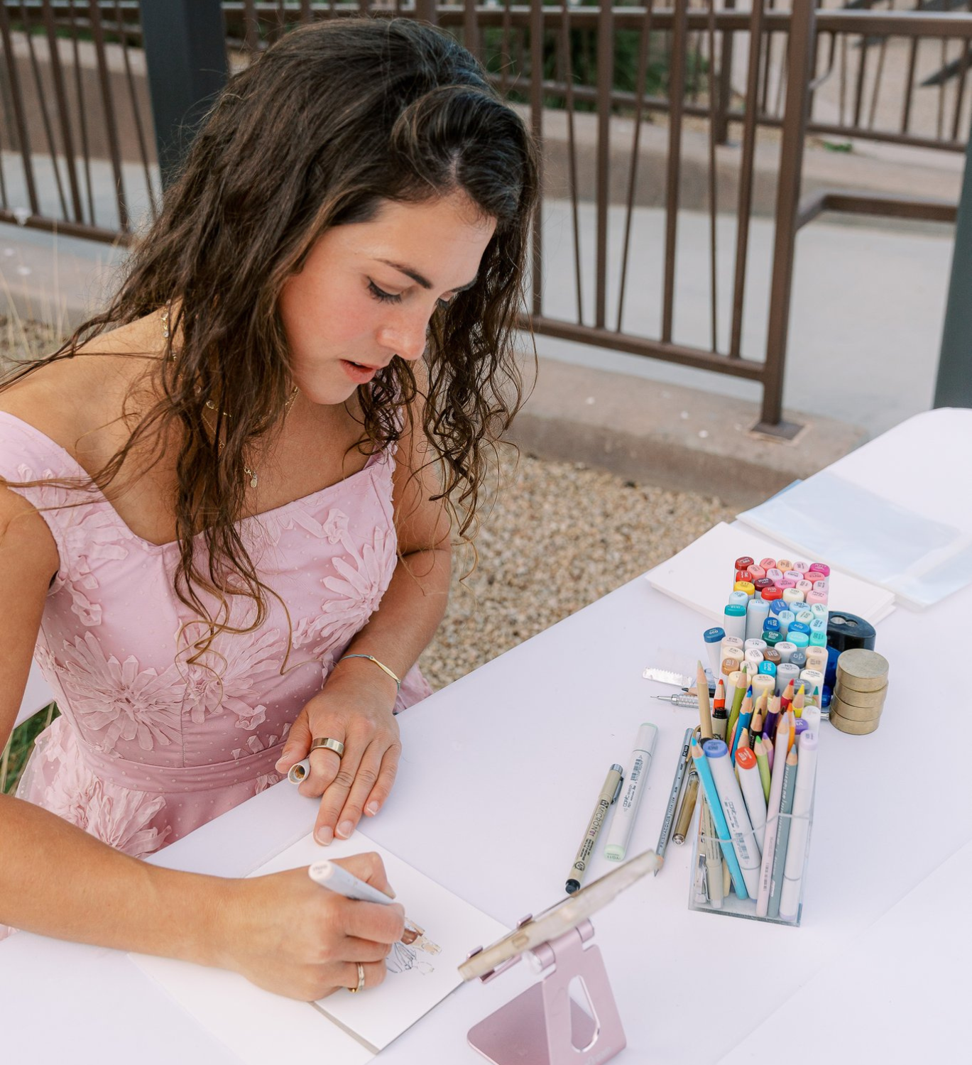 Emily provides all materials. She uses Copic markers on 5" by 7" archival quality paper. The high quality markers and pencils allow her to work quickly, leaving guests with vibrant pieces that will last for years.